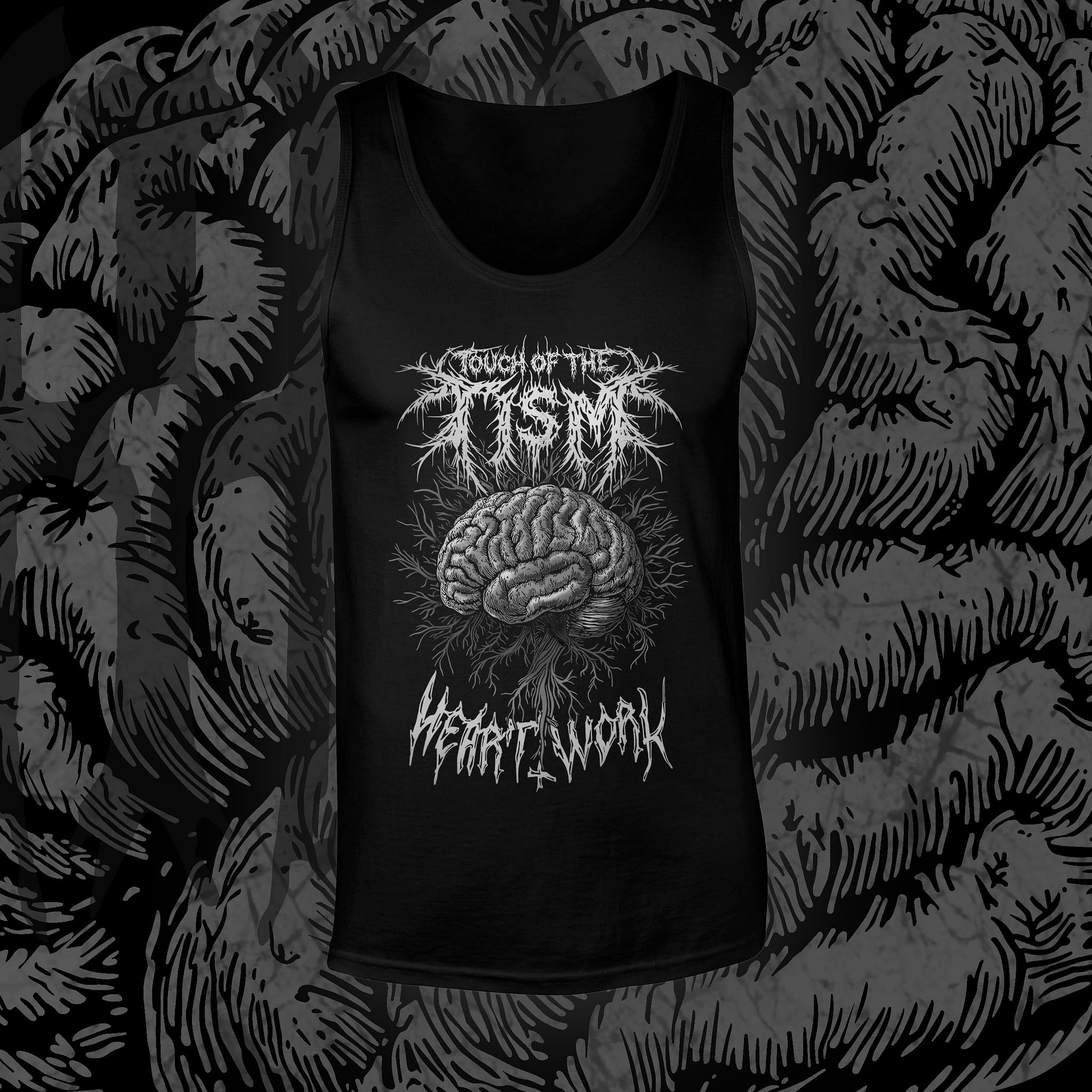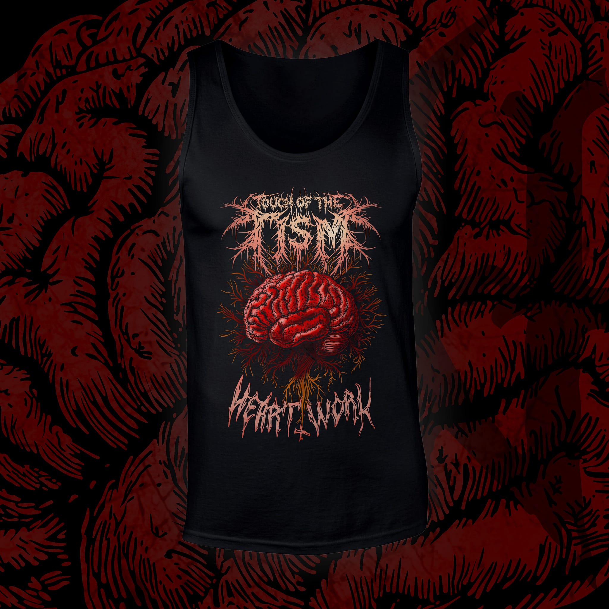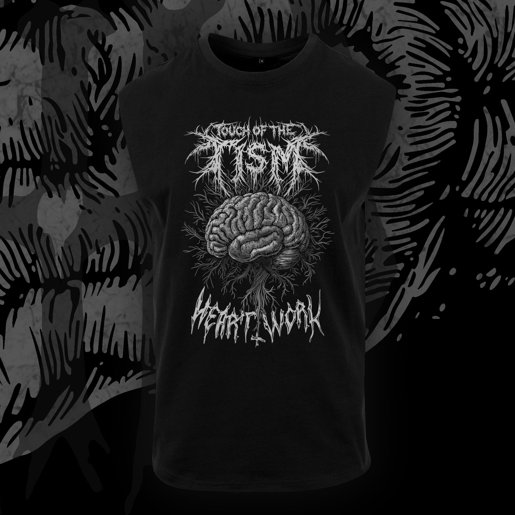 “Touch of the Tism” flips a phrase on its head and turns it into something that hits a little harder. The phrase has been designed like a brutal band logo and backed with accompanying artwork of a visceral brain graphic, this design leans into and represents the chaotic, intensified, and uniqueness of the neurospicy mind.